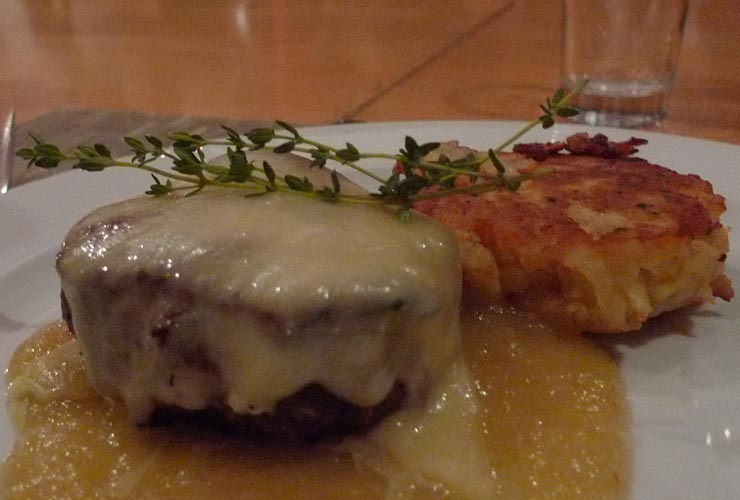 Kalbfleisch-Burger mit geschmolzenem Raclette-Käse und Kartoffelrösti