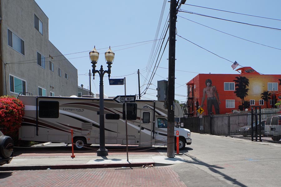 Unser erster Halt hatten wir in Venice Beach geplant. Doch in der Hochsaison mit einem grossen Wohnmobil… eine wahre Herausforderung! Eigentlich hatten wir schon fast aufgegeben, fuhr ganz unterwartet ein schicker Mercedes neben uns her und wir wurden aufgefordert, ihm nachzufahren. Wir wurden zu einem privaten Parkplatz direkt hinter der Strandpromenade gelotst. Für 20 Dollar durfte unser Wohnmobil eine Stunde dort parken. Einfach perfekt!