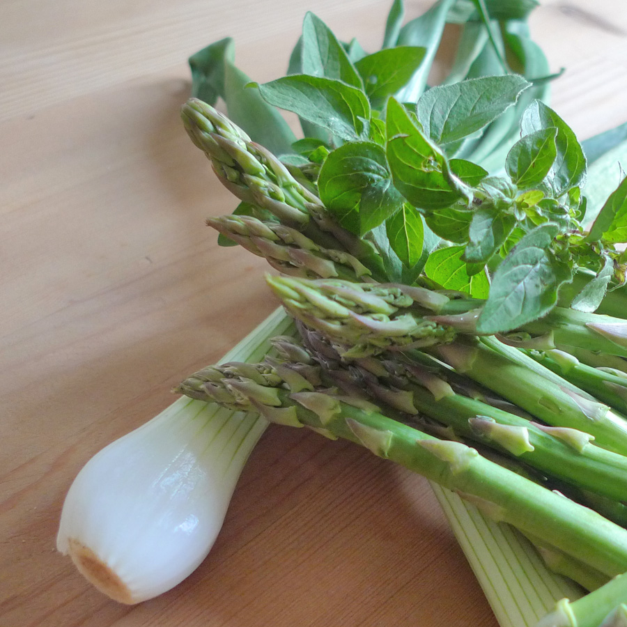 Spargel und Frühlingszwiebeln sind die frühlingshaften Hauptdarsteller, wobei die Nebenrolle des frischen Mayorans nicht zu unterschätzen ist.