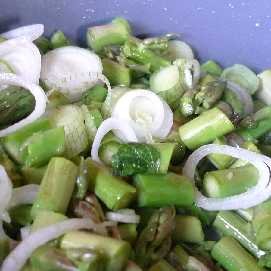 Spargel, Frühlingszwiebeln und Mayoran im heissen Olivenöl sautieren