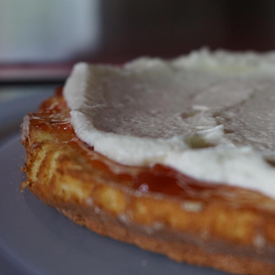 Das erste Biskuit mit etwas Konfitüre bestreichen. Ich habe mich für eine leicht säuerliche Rhabarber-Erbdeer-Marmelade entschieden :)