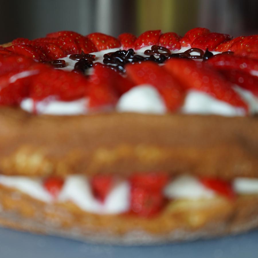 Das zweite Biskuit auf die Erdbeeren legen und die Arbeitsschritte wiederholen.