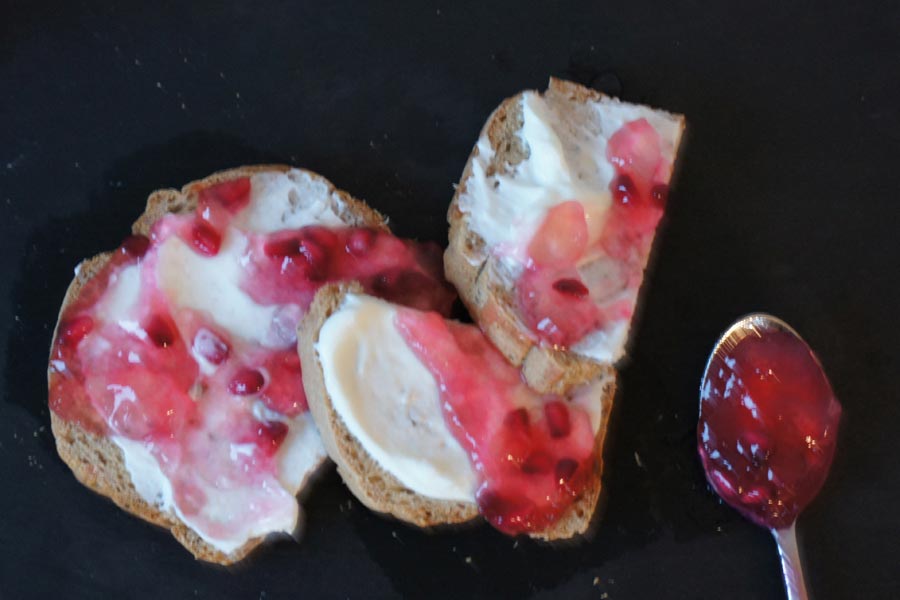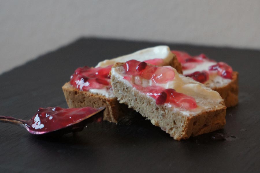 Für die Konfitüre habe ich eine Pomelo ausgepresst, einen Granatapfel geschält und zusammen mit Zucker und Geliermittel eine Marmelade gekocht, die speziell den „nicht ganz so süssen“ schmecken wird.