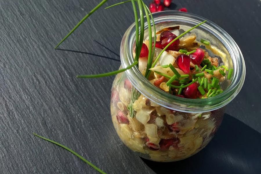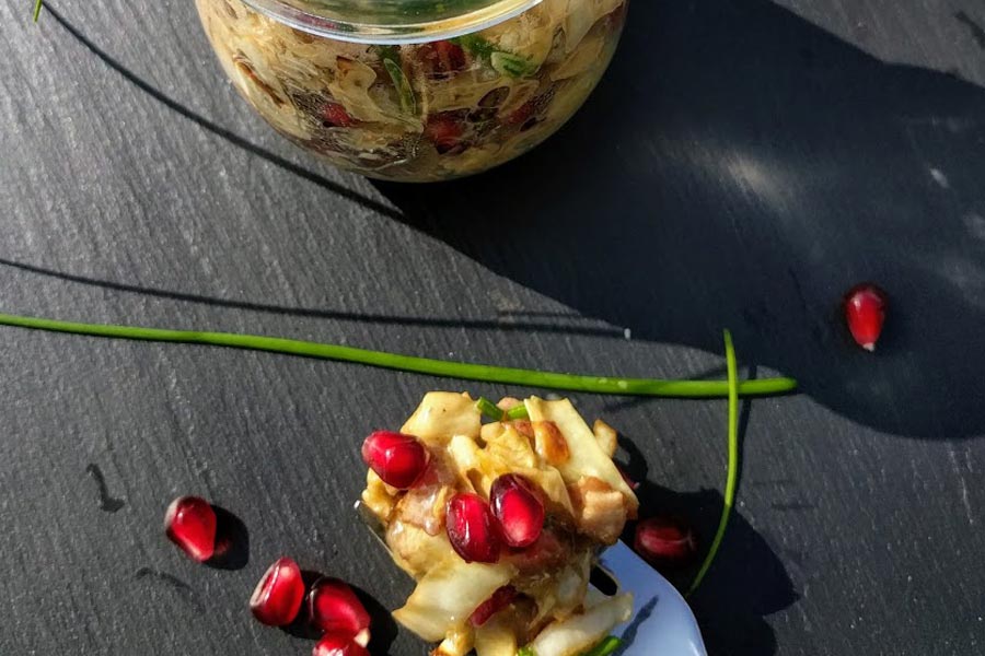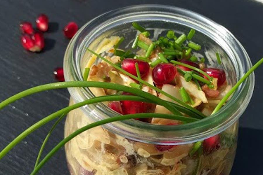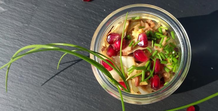 In der Salatschüssel kamen noch Salatsauce und die Granatapfelkernen dazu und fertig war ein leckeres Abendessen.