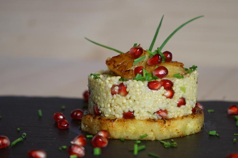 - Noch lauwarm in einer Schüssel mit Bio Rosmarin-Knoblauchsalz, Essig, Olivenöl, kleingeschnittener Frühlingszwiebel und Granatapfelkernen mischen.
