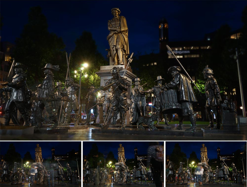 Im Fotoalbum von Amsterdam befindet sich unter anderem auch ein Bild vom «Rembrandplein» auf dem keine Meschen zu sehen sind. Obwohl das Foto zu relativ später Stunde entstanden ist, war der Platz trotzdem nie leer. Deshalb musste ich hier eine sehr nützliche Funktion von Photoshop einsetzen. Als Basis dienten mehrere Bilder die ich mit einem Stativ geschossen hatte. Diese Bilder habe ich dann in Photoshop geladen und bearbeitet.