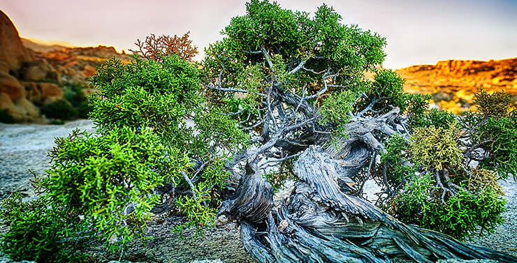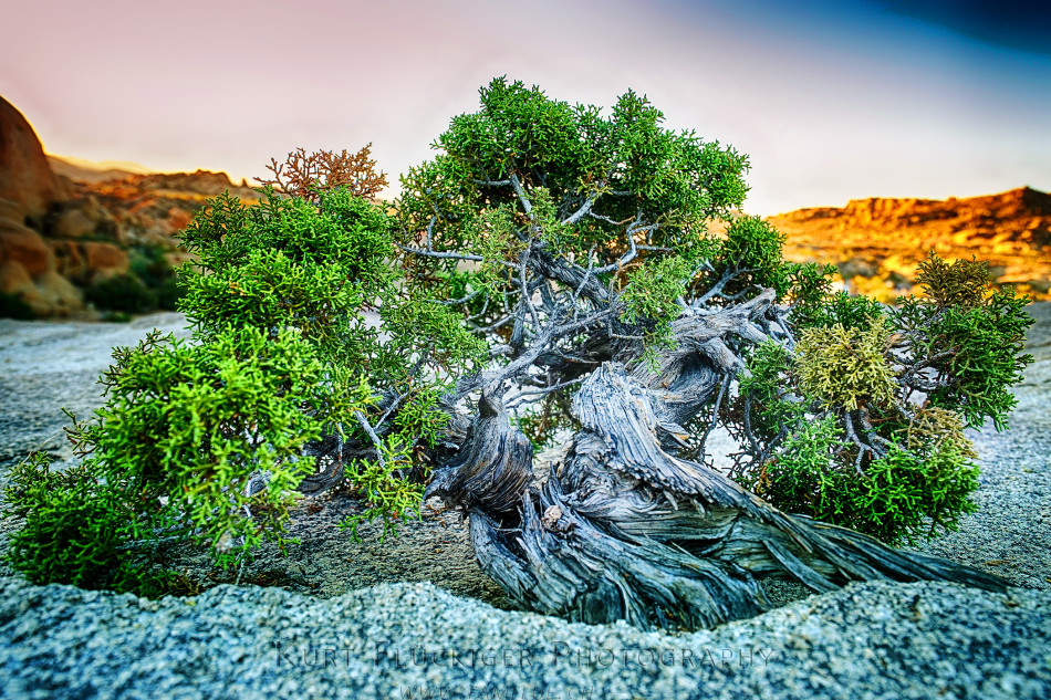 Der Wacholder (auf englisch "Juniper") scheint eine besonders 'zähe' Pflanze zu sein. Als Baum oder Strauch haben wir diese auf unserer USA-Reise fast überall, in den unterschiedlichsten Arten, angetroffen und war es noch so trocken, felsig und heiss. Einige besonders schöne Exemplare konnte ich im Joshua Tree Nationalpark fotografieren, wo sich die Pflanze aus schmalen Felsritzen heraus zwängte.