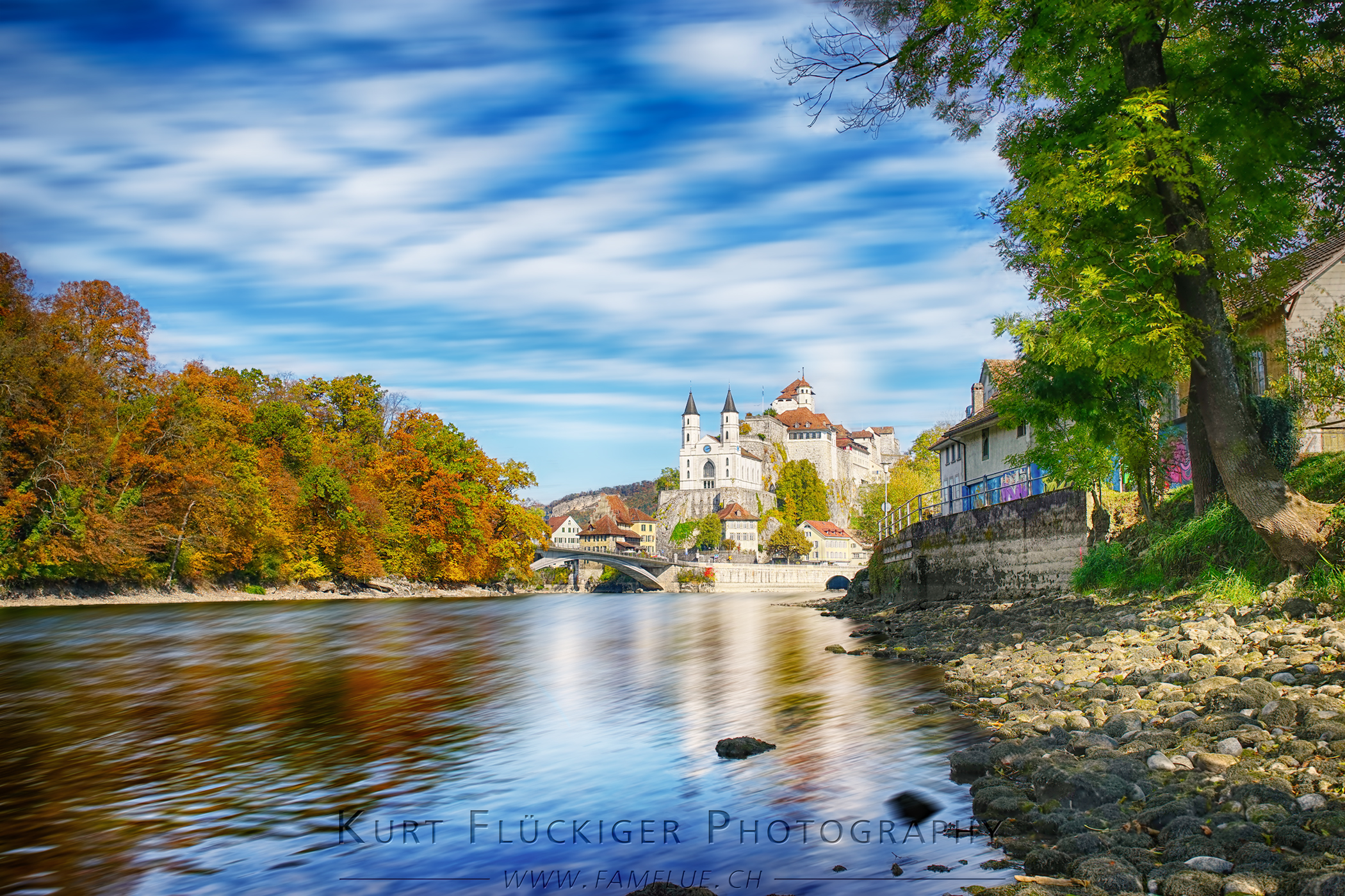 Deshalb hier zur Abwechslung mal wieder ein Foto aus der schönen Schweiz. Das Originalfoto ist am 22.10.2016 an der Aare bei Aarburg entstanden. Es war einer der wenigen schönen Herbsttage. Im Hintergrund ist die Kirche und die historische Festung von Aarburg zu sehen. Selbstverständlich musste ich das Foto auch diesmal mit Photoshop noch etwas weiter bearbeiten.