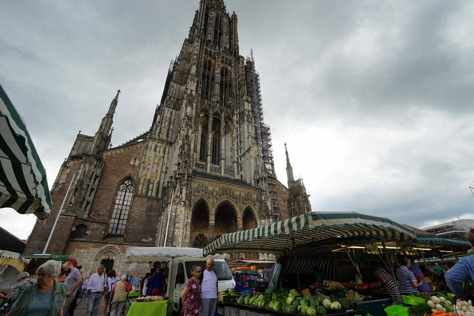 Vor zwei Wochen haben wir einen Ausflug nach Ulm gemacht. Als wir am Samstag auf dem Münsterplatz kamen, war der Wochenmarkt in vollem Gang. Deshalb war es eher schwierig ein Foto von der Vorderseite zu "schiessen".
