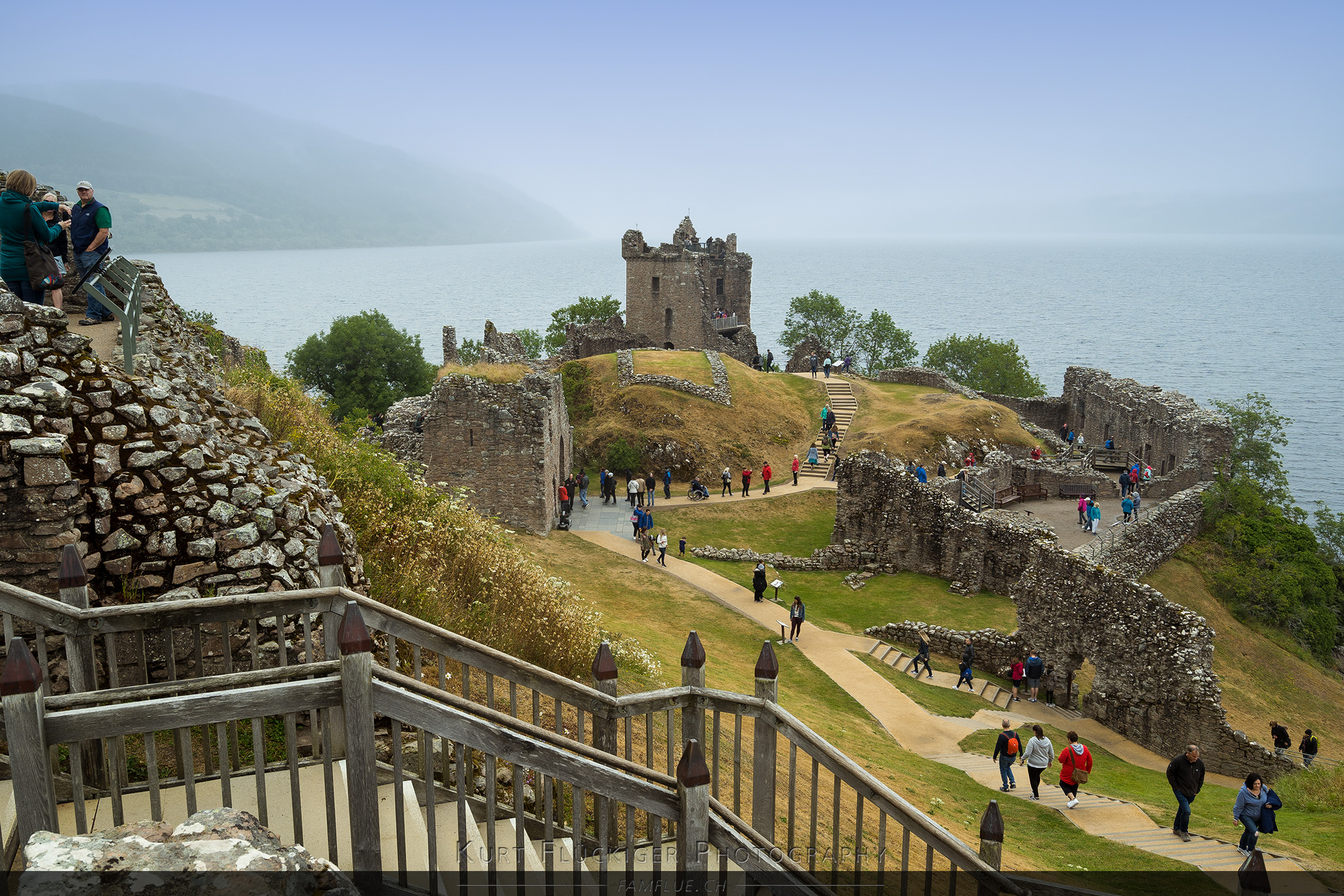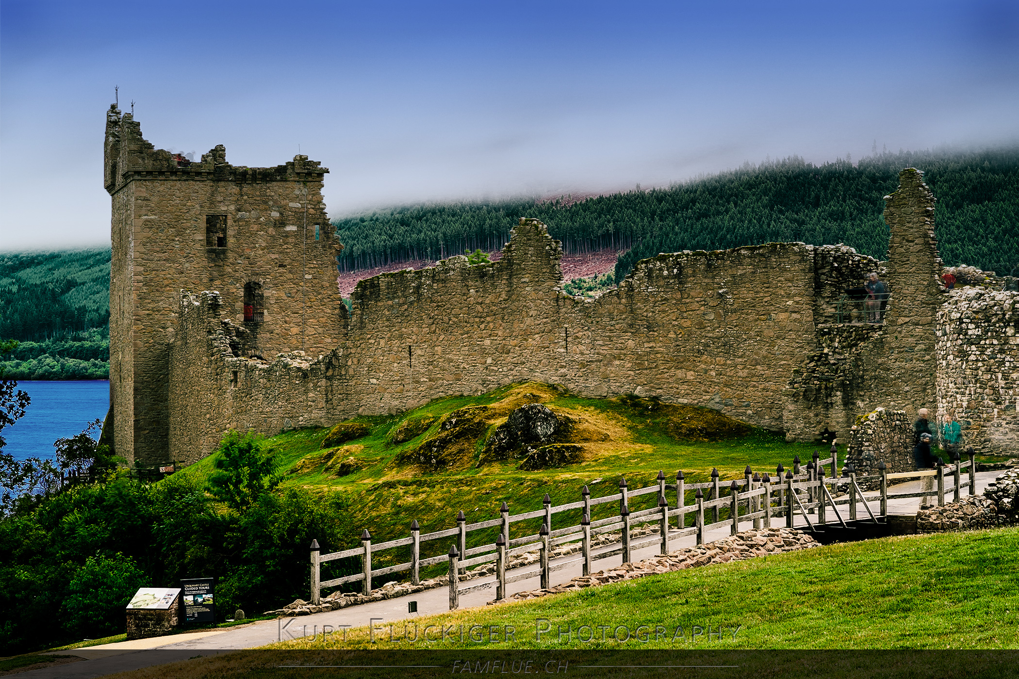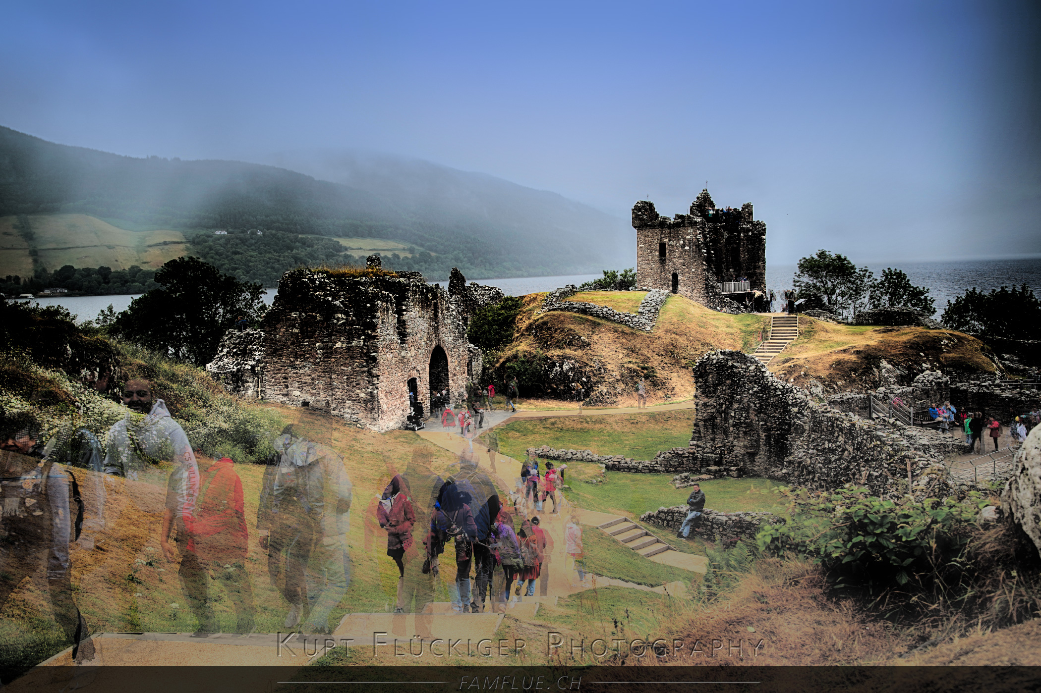 Eine weitere Möglichkeit, um die doch sehr zahlreichen Besucher beim Urquhart Castle, aus dem Bild zu entfernen ist eine Reihe von mehreren Bilder, in Photoshop in einen Stapel zu laden und über den Stapelmodus "median" zusammenzuführen. Für dieses Bild habe ich innerhalb von 30 Sekunden drei Fotos geschossen und diese zu Hause mit Photoshop zusammengeführt. Das automatisch generierte Resultat ist leider nicht ganz so gut rausgekommen und um die Menschen besser aus dem Bild zu bekommen wäre hier noch einiges an Handarbeite gefragt. :o Ohne weitere Bearbeitung sind die vielen "Geister" doch noch recht stark zu sehen. Das Bild hat aber trotzdem seinen Reiz.