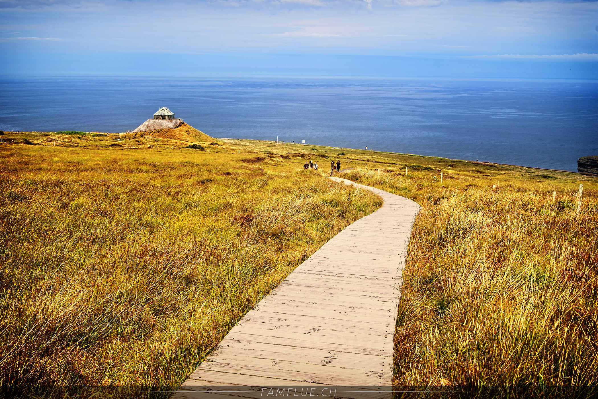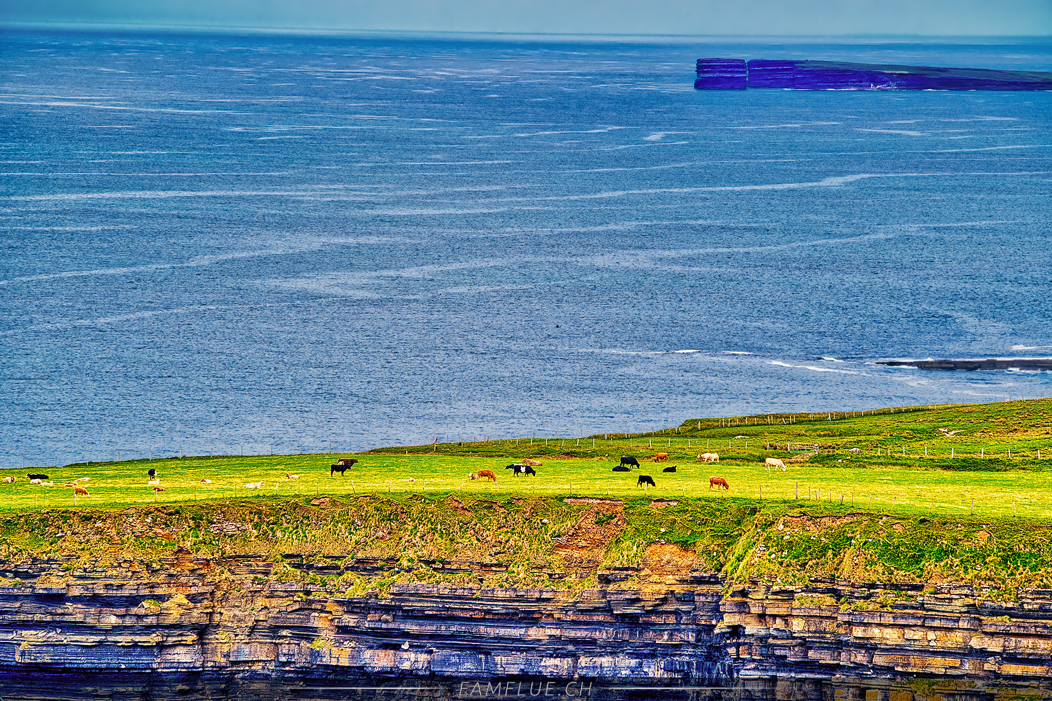 Dieses Bild ist ausserhalb der "Céide Fields" auf der anderen Strassenseite entstanden. Im Vordergrund sind weidende Kühe direkt an der steil abfallenden Küste zu sehen. Im Hintergrund sieht man den "Downpatrick Head"