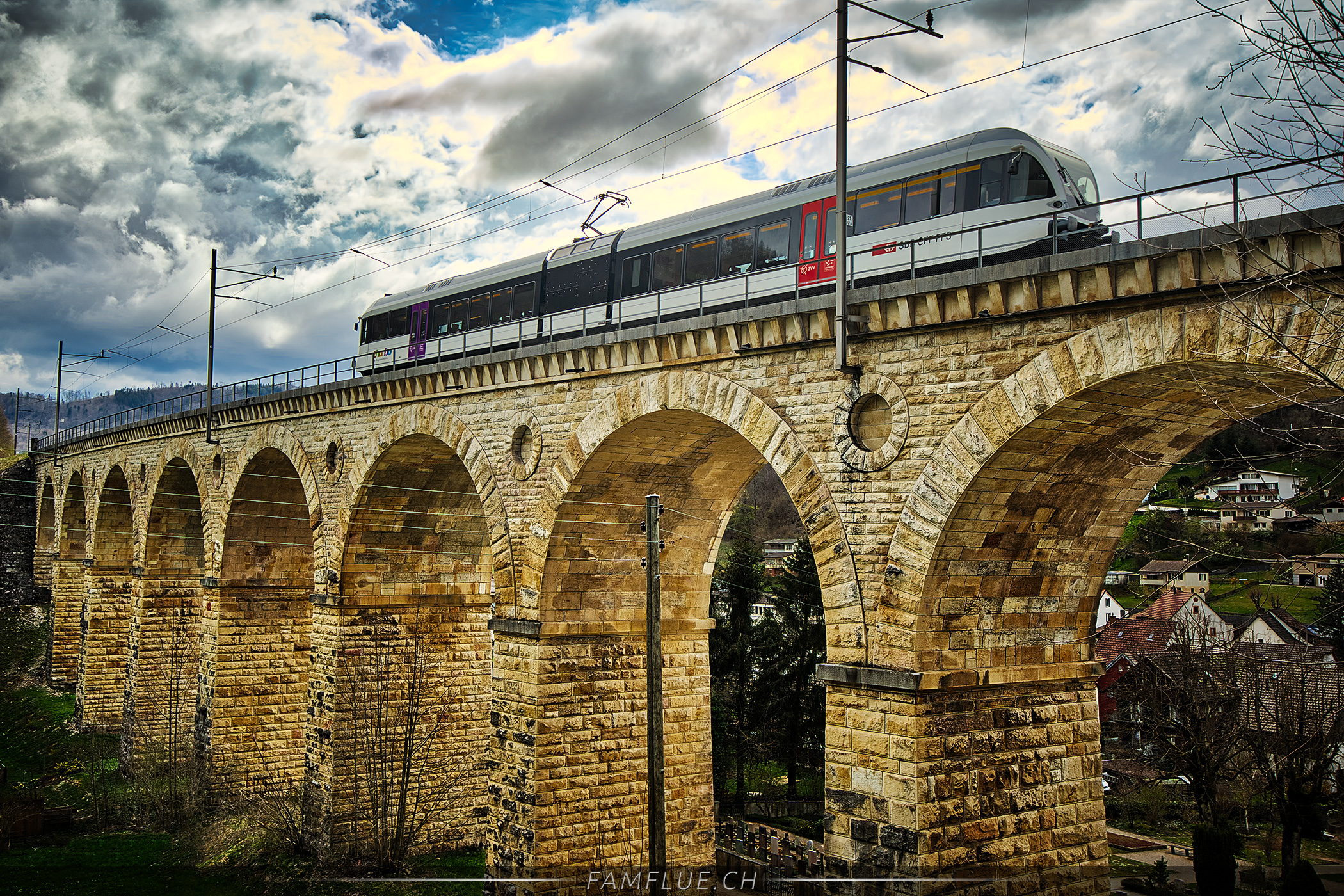 Der Zug fährt über das Bahnviadukt bei Rümlingen