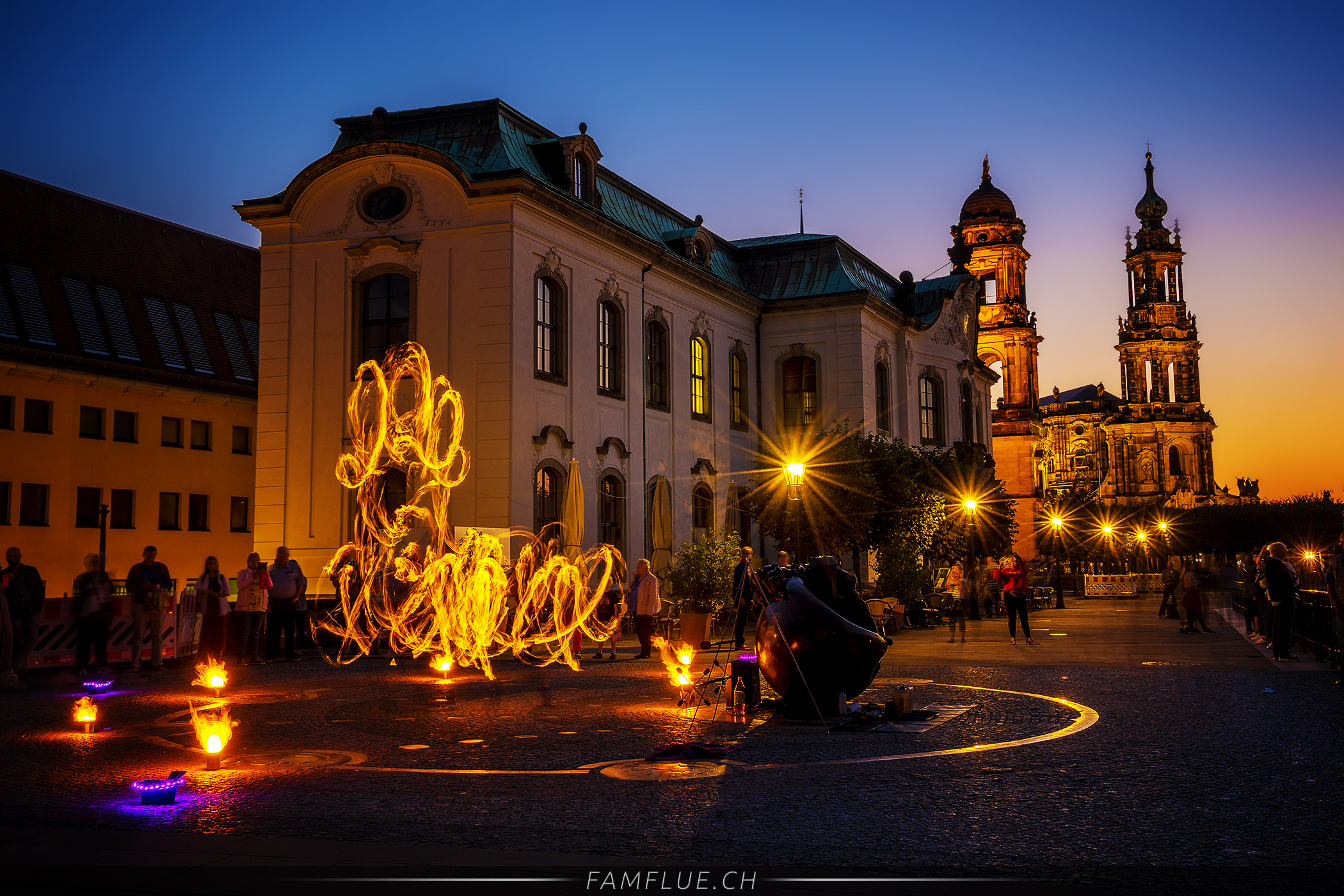 Kurz nach Sonnenutergang warteten wir noch bis die Lampen auf der Brühlschen Terrasse eingeschaltet wurden. Als die Dämmerung dann einsetzte, tauchte ein Feuerkünster auf, der mit seinen "Fakeln" tanzte. Und erneut bin ich doch eher wieder unerwartet auf ein schönes Motiv für eine Langzeitbelichtung gestossen. Im Vordergrund die gezeichneten Bewegung des Feuer-Artisten, im Hintergrund der beleuchtete Turm vom Oberlandesgericht Dresden, die katholische Hofkirche und ein wünderschönes Abendrot. - Schöner könnte man es sich kaum ausdenken!