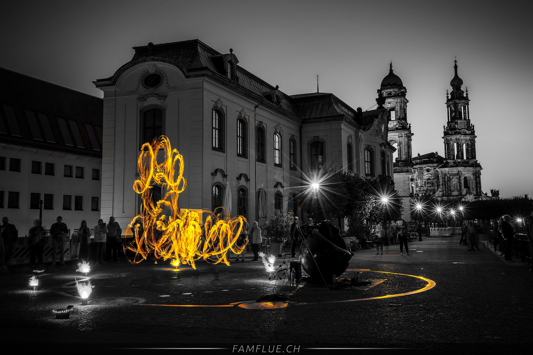 Später am Abend, wieder auf der Brühlschenterrasse in Dresden, sind wir dann diesem Feuerkünstler begegnet.