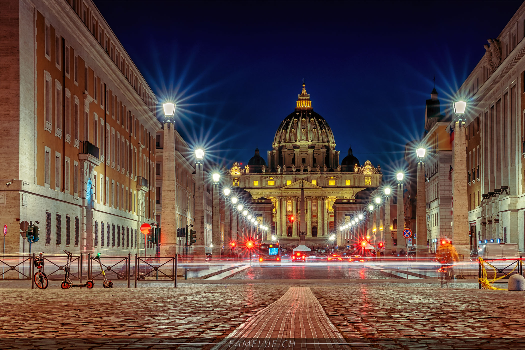 Auf der "Via della Conciliazione" habe ich mein Stativ aufgestellt um diese Langzeitbelichtung aufzunehmen. Auf dem Bild kann man in der Mitte noch ganz knapp den, kaum beleuchteten "Obelisco di Piazza San Pietro" erkennen und dahinter den 'erleuchteten' Petersdom (Basilica di San Pietro). Durch die kleine Blende von 22f kommen die Strahlen der beleuchteten Strassenlampen sehr schön zur Geltung.