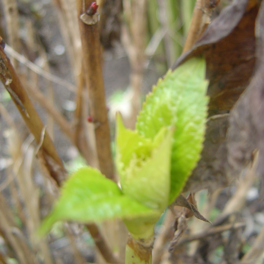 Zwischen vielen welken Blättern der Hortensie leuchten frische Triebe.