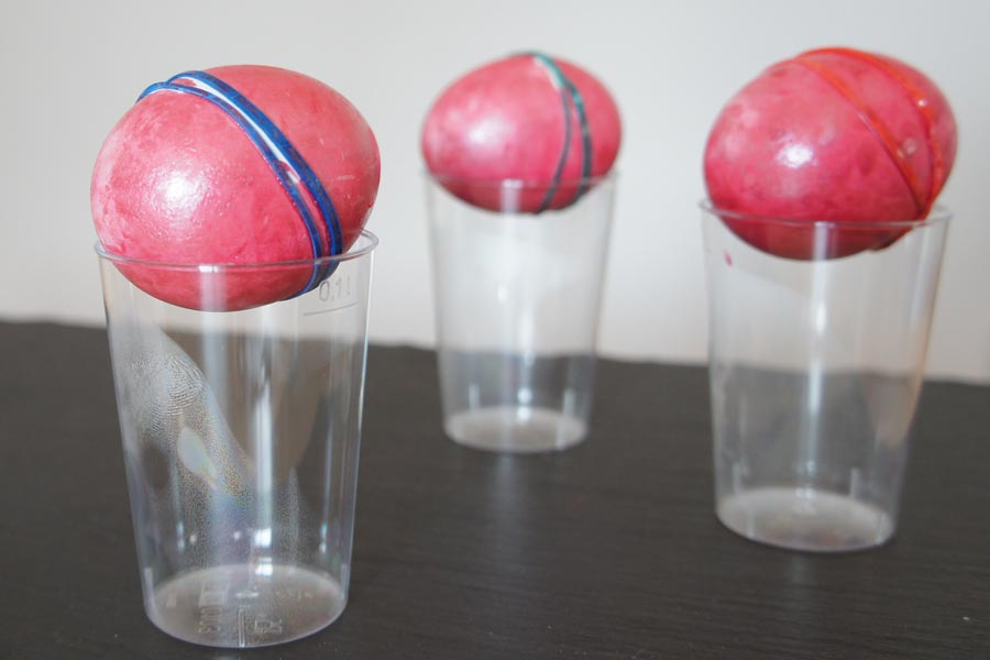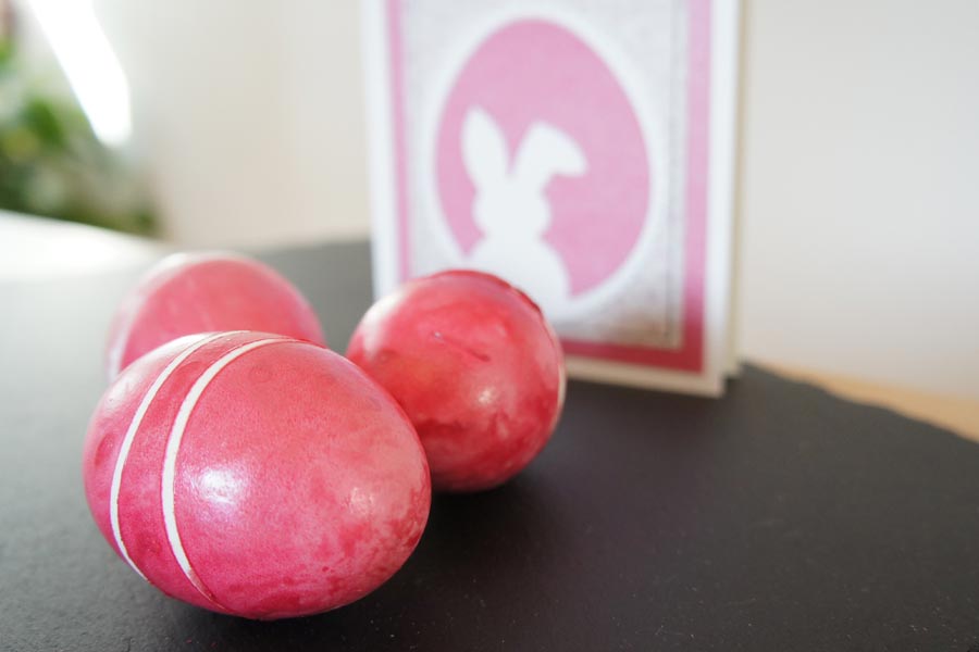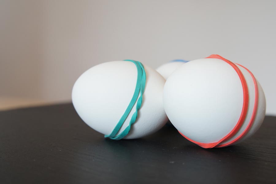 Die Eier werden gekocht, noch heiss mit einem Haushaltsgummi umspannt und anschliessend in ein Farbbad gelegt.